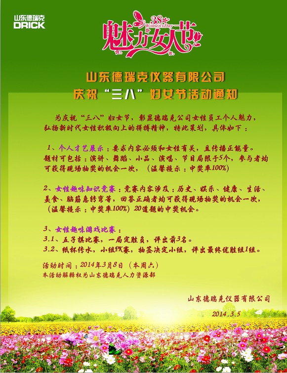 我國(guó)于1949年12月規(guī)定每年的3月8日婦女節(jié),迄今為止已有60多年的歷史,而今年恰逢是三八婦女節(jié)第65周年。為了活躍企業(yè)文化氛圍,表彰和感謝女同胞們?yōu)楣咀龀龅呢暙I(xiàn),山東德瑞克儀器有限公司決定于3月8日為所有女員工準(zhǔn)備了一系列別開(kāi)生面的歡慶活動(dòng),在表彰和感恩的同時(shí)也為德瑞克女同胞們展示個(gè)人才藝,彰顯女性風(fēng)采提供了一個(gè)良好的舞臺(tái)?;顒?dòng)具體內(nèi)容如下: